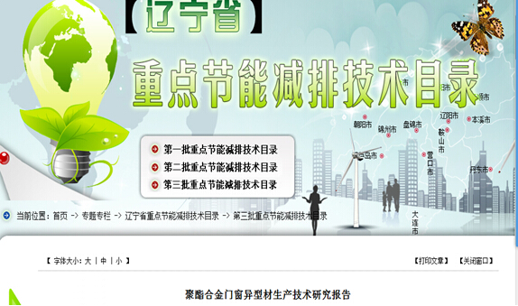 遼寧省政府為加快推進(jìn)重點節(jié)能減排技術(shù)的推廣普及,引導(dǎo)企業(yè)采用先進(jìn)新技術(shù)、新工藝及新設(shè)備,涉及冶金、能源、石化、化工、電力、建筑、建材、裝備制造和環(huán)保等行業(yè),共評選出30項重點節(jié)能減排技術(shù)。實德聚酯合金門窗異型材生產(chǎn)技術(shù)研究進(jìn)入此目錄。