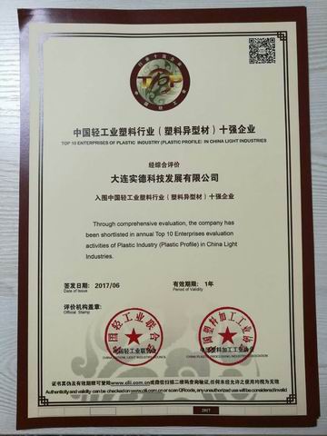 實(shí)德研究院申報(bào)的中國(guó)輕工業(yè)行業(yè)十強(qiáng),經(jīng)過(guò)行業(yè)協(xié)會(huì)領(lǐng)導(dǎo)及專家審查,實(shí)德科技公司被評(píng)定為“中國(guó)輕工業(yè)(塑料異型材)十強(qiáng)企業(yè)”。