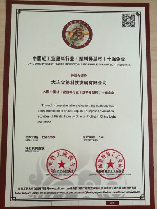 經(jīng)行業(yè)協(xié)會(huì)領(lǐng)導(dǎo)及專家審查,實(shí)德科技公司被評(píng)定為“2018-2019年度中國輕工業(yè)(塑料異型材)十強(qiáng)企業(yè)”。