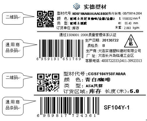 產(chǎn)品條碼標(biāo)簽粘貼在型材產(chǎn)品整包外包裝的端部,標(biāo)識(shí)包內(nèi)型材產(chǎn)品種類、規(guī)格、產(chǎn)地、訂貨單位等相關(guān)信息。設(shè)計(jì)使用的條碼標(biāo)簽有兩種形式。帶合格證信息的標(biāo)簽,在大連、天津、漯河、成都、銀川、長(zhǎng)春基地使用;不帶合格證信息的標(biāo)簽,在嘉興基地使用。